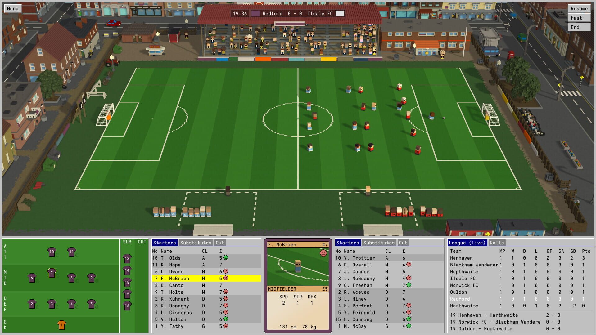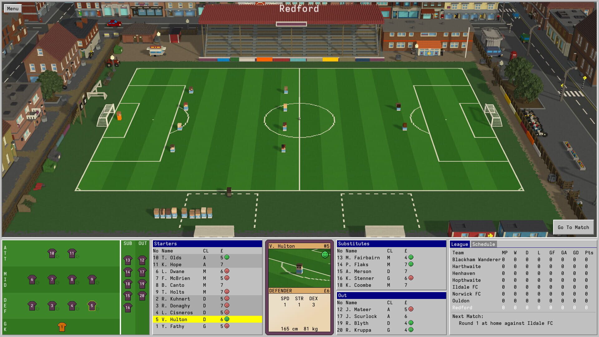 Manage your team in this voxel based football (soccer) management simulator. Make active decisions directly influencing the events in the match. Can you win the league?