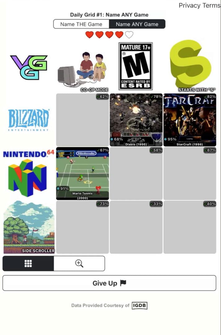 Browser-based video game trivia with daily 3x3 puzzles to solve and share results. Powered by IGDB.